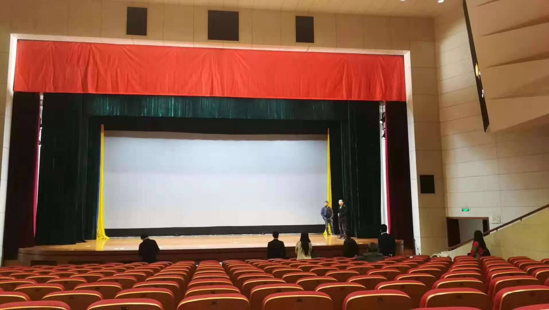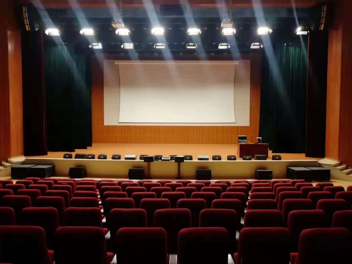 1. 防火幕:防火幕緊貼臺(tái)口;一般超過1200坐,要求必須設(shè)計(jì)防火幕;2. 前沿幕(徽標(biāo)):防火幕以后,間隔300mm左右;若沒有防火幕緊靠臺(tái)口200-300mm;3. 對開大幕: